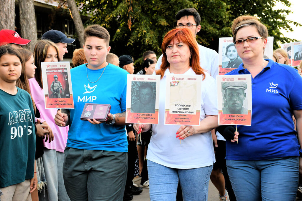 120 воинов встали в «МИРовой Бессмертный полк» третьей летней смены лагеря «Мир». Фотографии своих прадедов и прапрадедов, защищавших нашу Родину в Великую Отечественную войну, пронесли в почётном строю их правнуки и правнучки. А в руках вожатой 26 отряда Валерии Литвиновой портрет отца и орден Мужества, которого наградили бойца СВО посмертно. Олег Александрович Литвинов погиб в боях за Курахово.